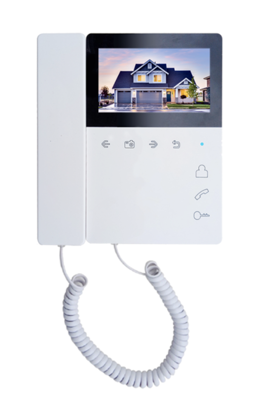 Elly-S с трубкой - Монитор видеодомофона 4,3 дюйма, TFT LCD, с трубкой на магните. Возможности подключения: 4 монитора, 2 вызывные панели, 2 видеокамеры. Поддержка microSD карты, запись фото / видео на microSD до 32 ГБ или фото во внутреннюю память не менее 64 кадров. Адресный интерком, 25 мелодий. Питание 220 В.